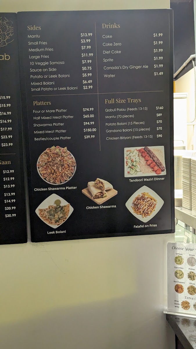 Specialty items include family platters and limited-time deals like the 2 Chicken Shawarma Wrap Deal and authentic Afghan Mantu dumplings, which are prepared with seasoned ground beef and served with split peas sauce and garlic yogurt.